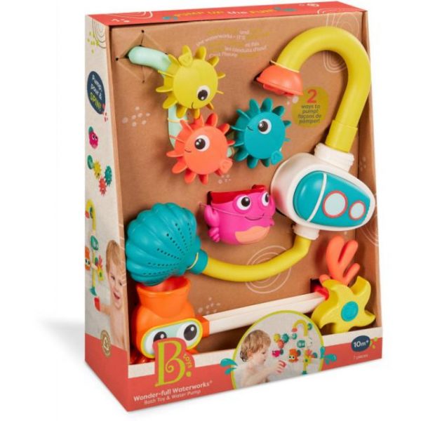 B Toys – Bath Toy Pump up bathtime and let the fun times flow with the Wonder-full Waterworks from B. toys! This 7-piece submarine-themed waterplay set is designed to make bath time an exciting adventure.Features: Includes a water pump that sucks up bath water and pours it back out with a lil’ faucet. Comes with an octopus funnel, water cup, crab drip cup, 3 spinning fish gears, and a starfish spinner. Features a water channel with a seaworthy starfish spinner. Battery-powered mode for automatic water pumping or manual pumping with the submarine button. Customisable pieces that stick to the side of the tub with suction cups. Encourages fine motor skills and problem-solving skills. Recommended for children 10 months and older (batteries included). With the Wonder-full Waterworks, kids will love setting up their very own waterworks while enjoying a splash-tastic time in the bath. This engaging bath toy not only provides endless fun but also supports developmental skills in a playful environment. For ages 1 and up Department Code: 3320